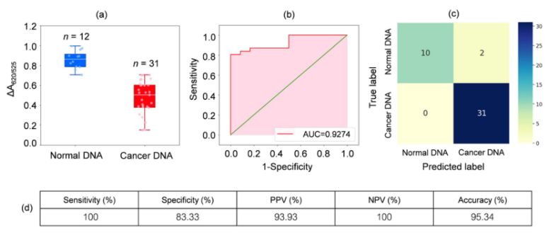 (DA650/525) of box plots; (b) ROC analysis and evaluation of diagnostic tests. (c) Confusion matrix for the diagnosis of normal and cancer patients. (d) Sensitivity, specificity, positive predictive value (PPV), negative predictive value (NPV) and accuracy of the developed method.