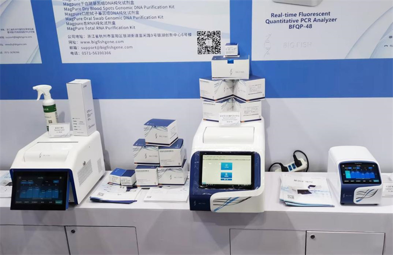 As a national high-tech enterprise focusing on the field of life science molecular biology, Hangzhou Bigfish Bio-tech Co,. Ltd. carried the latest fluorescence quantitative PCR analyzer BFQP-96, gene amplification instrument FC-96GE and FC-96B to the Shanghai National Convention and Exhibition Center, in addition to related kits such as: Whole blood genomic DNA purification kits, plant genomic DNA purification kits, animal tissue genomic DNA purification kits, oral swab genomic DNA purification kits, viral DNA/RNA purification kits, bacterial genomic DNA purification kits, etc.